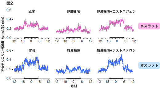 そして、卵巣や精巣を摘除して血中のエストロジェンやテストステロンを低下させると、いずれの性においても夜間のアセチルコリン分泌量が減少することが分かりました。そこで、メスではエストラジオール(エストロジェン)、オスではテストステロンの補充を行なったところ、夜間のアセチルコリン分泌量は正常ラットと同等にまで回復しました。しかし、オスへのエストラジオール、メスへのテストステロンの補充は効果がありませんでした。