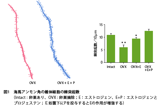 一方、20年以上も前ですが、上記のようにメスラットの卵巣を摘除しますと、海馬のアンモン角(CA1)という場所の錐体細胞と呼ばれる神経細胞の樹状突起の棘(とげ;神経細胞が情報を受け取る場所)の数が激減しますが、エストラジオール補充することで、棘の数が回復することが報告されていました(図1、文献10)。CA1は動物が学習するのに必要な場所です。ただし、このエストラジオール作用は、錐体細胞自体にはエストラジオール受容体が存在しないので、介在ニューロンにある興奮性の伝達物質であるグルタミン酸の受容体(とくにNMDA受容体)を増加させることによることが示されています(文献11)。