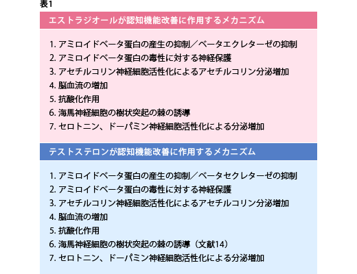 表1に、エストラジオールとテストステロンが認知症改善に働く作用をまとめておきます。2つのホルモンが全く同じ作用をもつことに注意!!